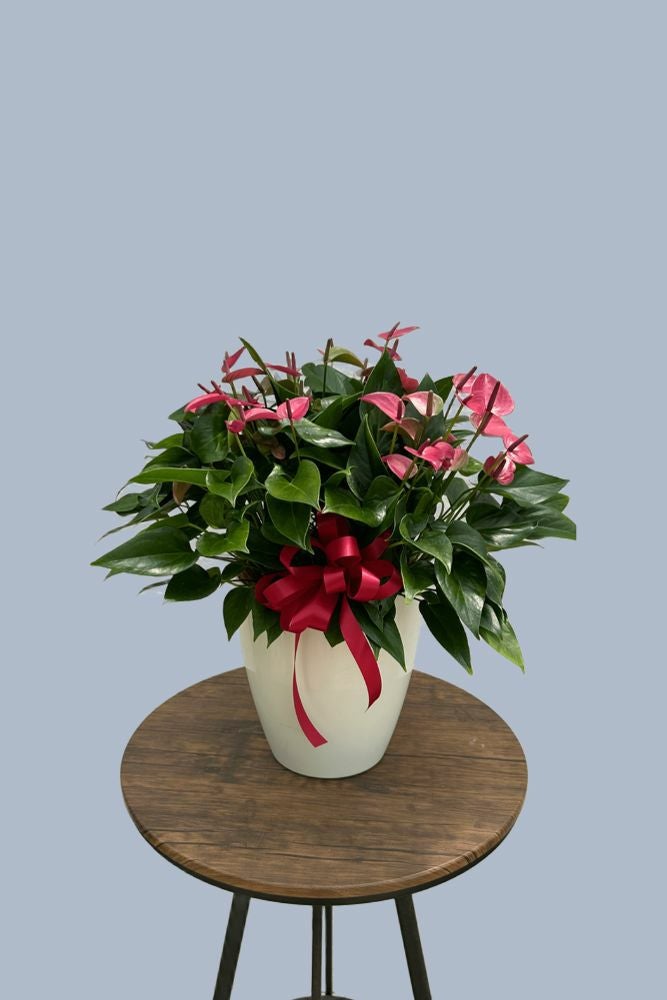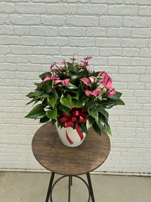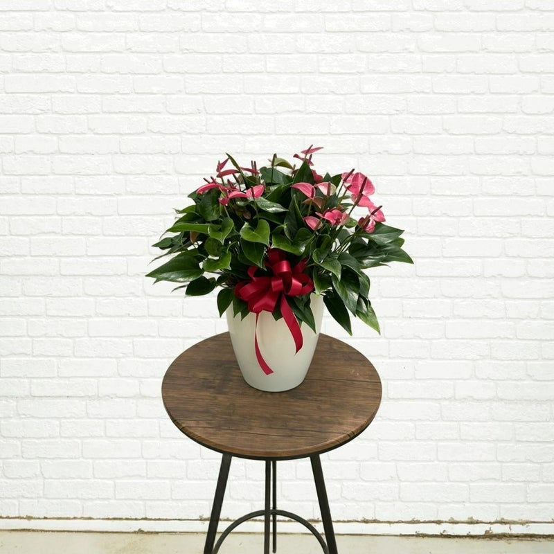【アンスリューム】 ハート型した花が可愛らしい花観葉植物です。花は、実際には苞と言い葉が色づいたモノのため長く楽しめます。上手に育てたら再び花が付くので、贈られた方が園芸が好きな方ならば喜ばれる一品です。