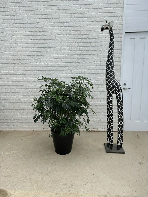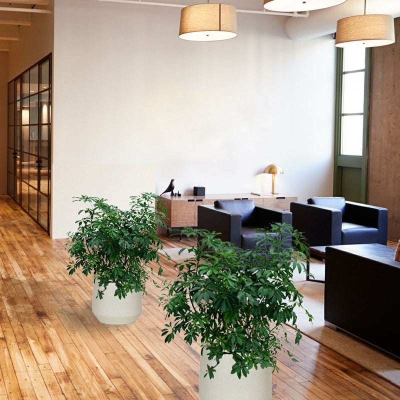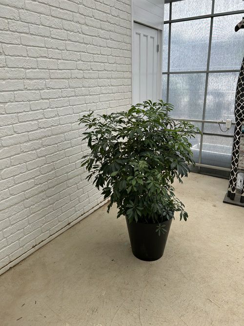 【シェフレラ】 丸みのある葉が放射状に広がるシェフレラ。丈夫で育てやすく、オフィスグリーンとしても人気があります。空間に自然な癒しを与える、グリーン初心者にもおすすめの一鉢です。