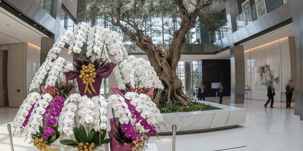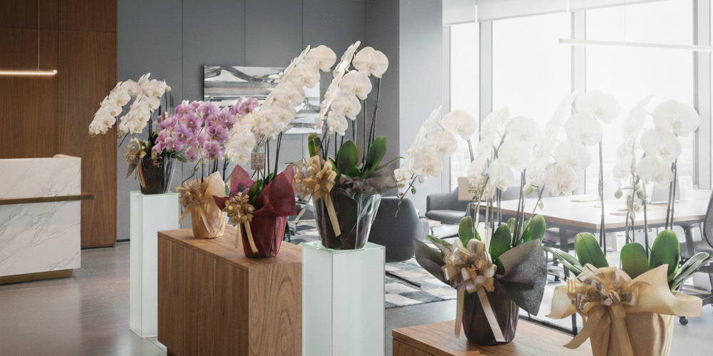 法人ギフトとして贈られた胡蝶蘭は、主にオフィスや店舗の“顔”となる空間に飾られます。 ビジネスシーンでは、来客の第一印象を左右する場所に設置されることが多く、空間演出の一部として重要な役割を担います。