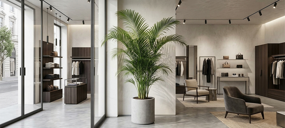 また、スタイリッシュな印象を与えたい場合は、放射状の葉が美しい「ユッカ・エレファンティペス」や、モダンな鉢に合わせた「セフリジヤシ」を配置することで、商品(服や展示物)を邪魔することなく、高級感のある「リゾートのラウンジ」のような空間を創出できます。