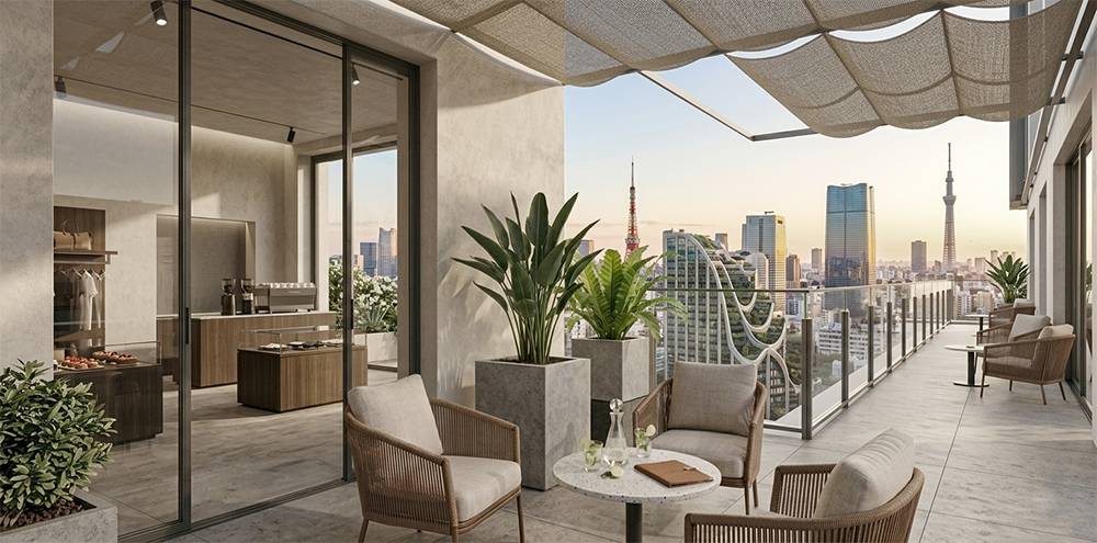 また、コンクリート調の大型プランターにこれらの植物を配置することで、都会的でありながら自然の力強さを感じる「涼しげなオアシス」を演出。店外を通る人々に対しても、上質な空間体験を予感させ、入店を促す強力なキャッチーな役割を果たします。