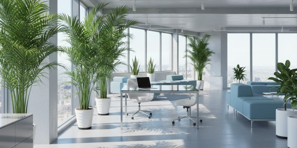 アレカヤシは、鳥の羽のような軽やかな葉姿が非常に涼しげで、夏のオフィスの雰囲気にぴったりです。